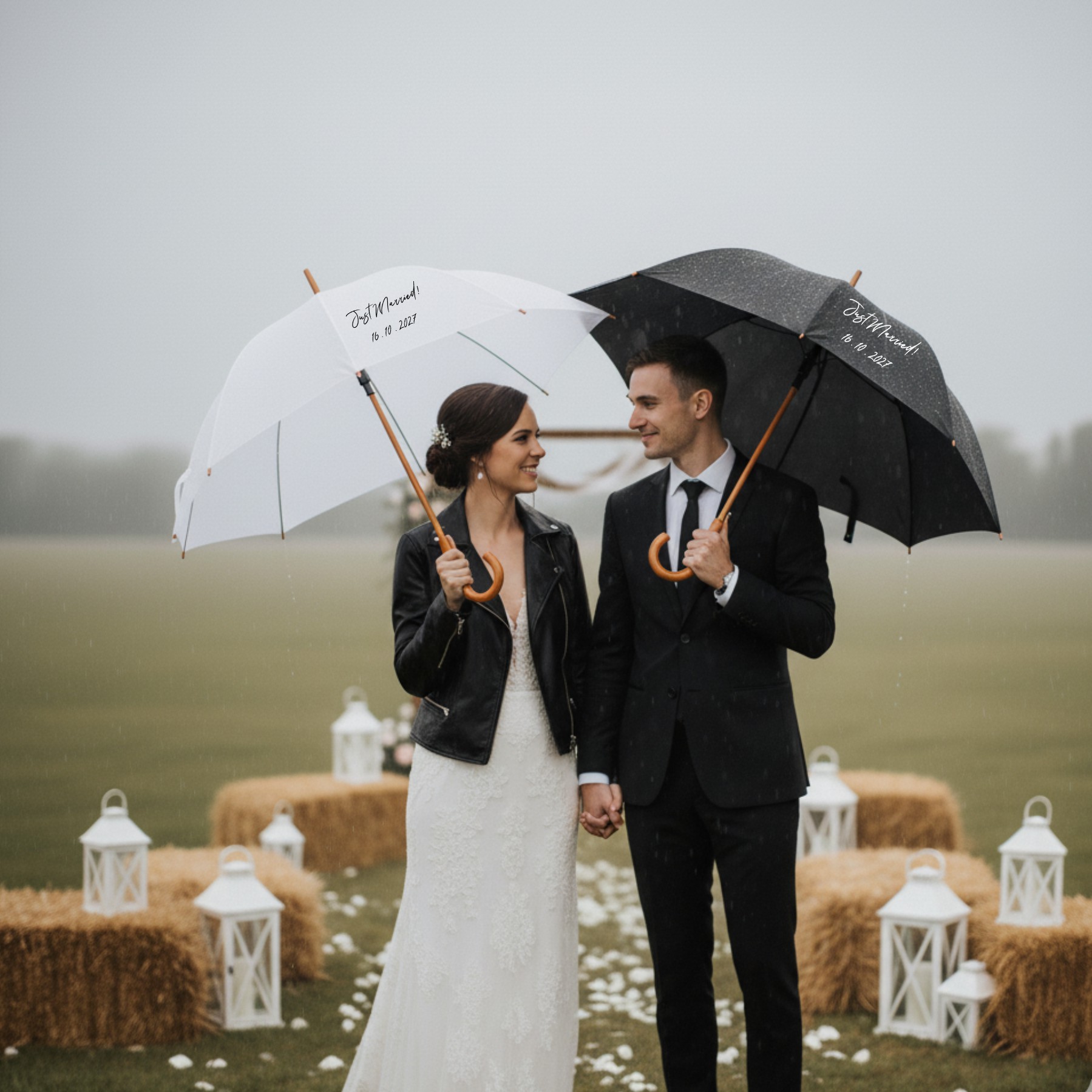 La personnalisation incluse transforme ce parapluie en souvenir unique et intemporel. Plus qu’un accessoire, il devient un véritable détail mode qui complète parfaitement une robe de mariée et une veste chic.