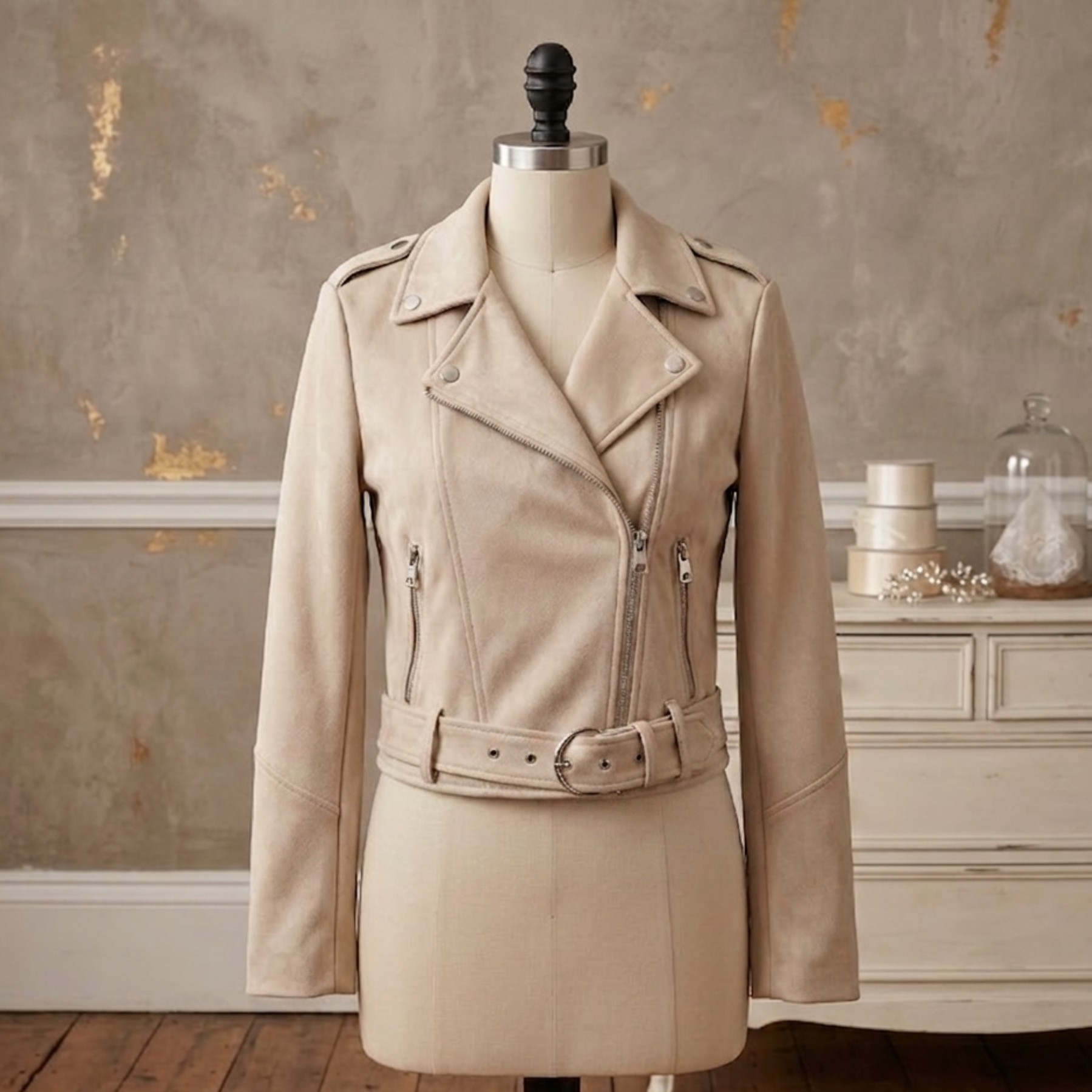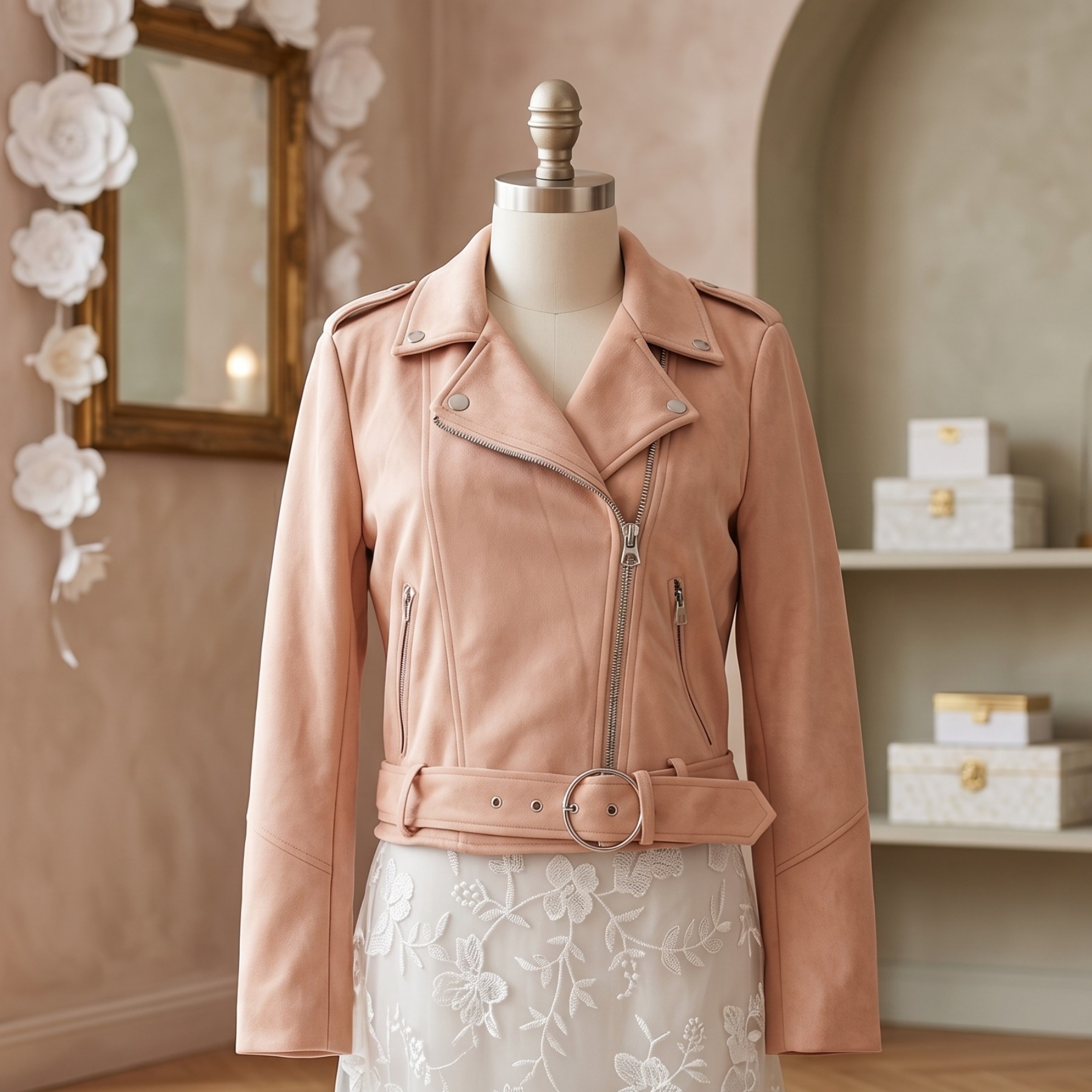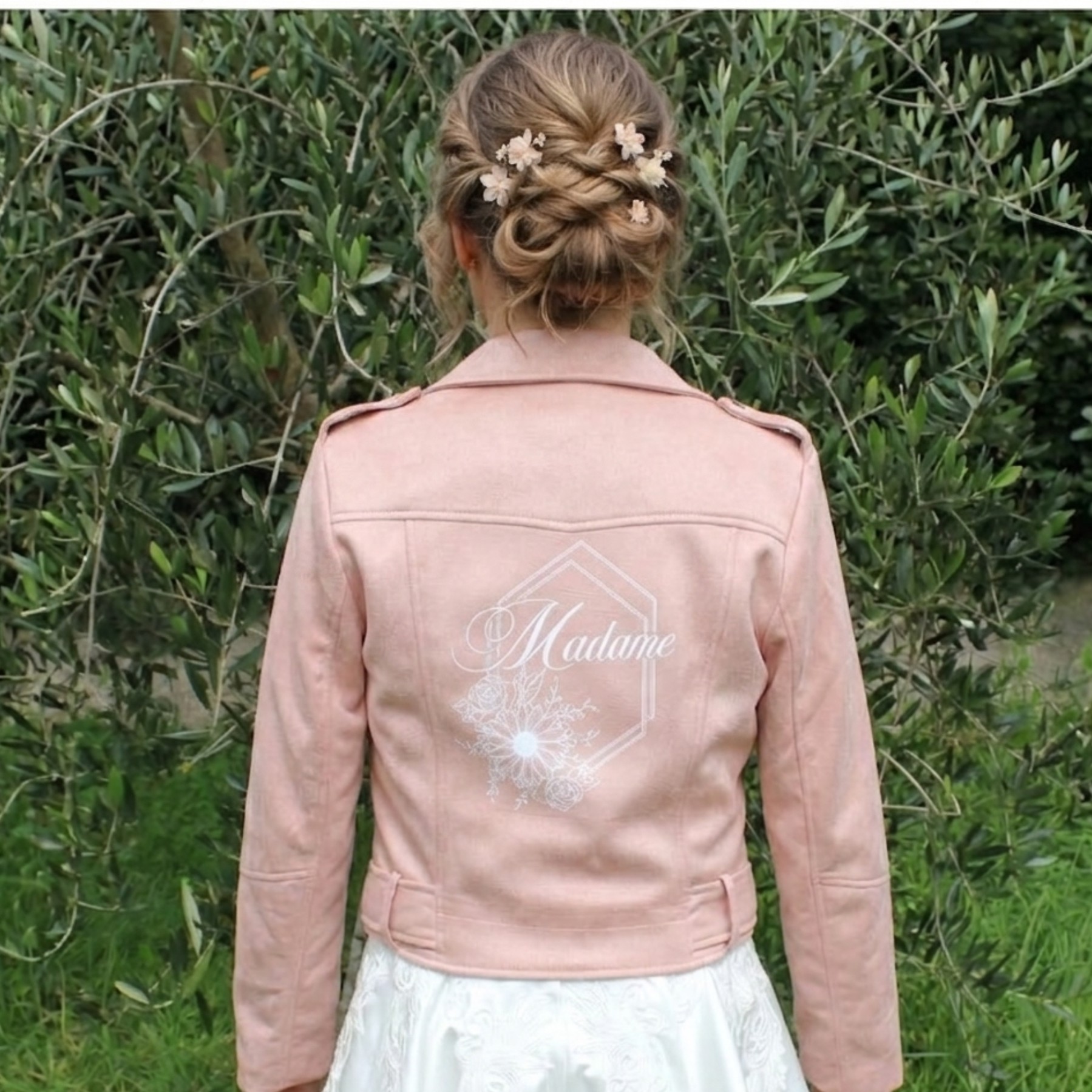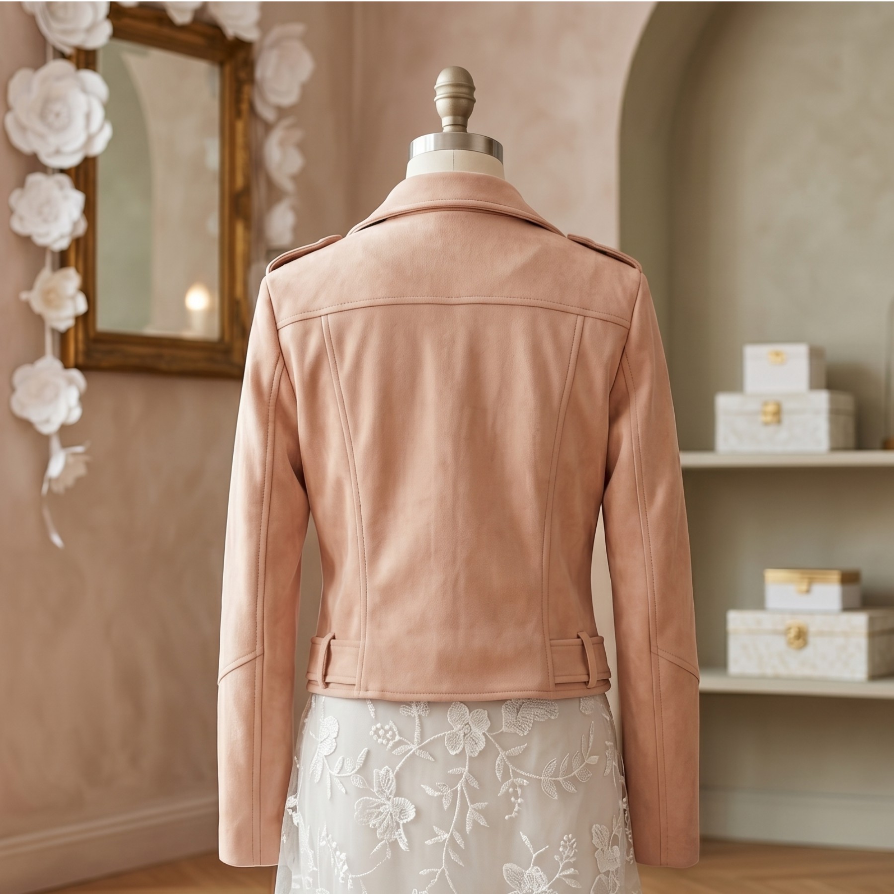 Sublimez votre tenue de mariée avec ce perfecto en suédine (100% polyester) vieux rose entièrement personnalisable. Laissez libre cours à votre imagination et créez une pièce unique qui vous ressemble pour le plus beau jour de votre vie.