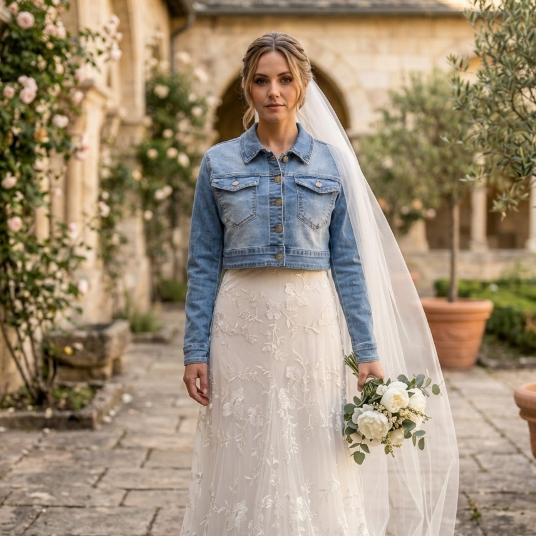 Apportez une touche de fraîcheur et de modernité à votre tenue de mariage avec notre veste en jean courte Anna. Conçue pour sublimer votre silhouette sans masquer les détails de votre robe, sa coupe « cropped » et son fini denim délavé créent un contraste parfait avec la dentelle et le tulle.