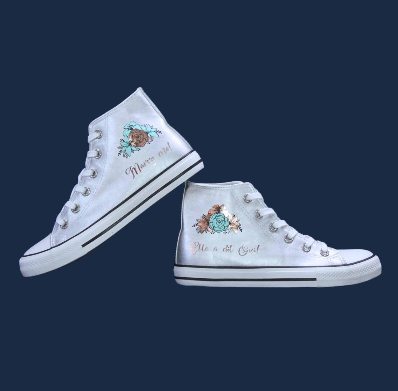 Sublimez votre tenue de mariée avec ces baskets hautes au fini argenté étincelant. Pensées pour les femmes qui souhaitent vivre leur grand jour avec audace, elles arborent fièrement le message « Elle a dit Oui ! » accompagné de délicats motifs floraux.