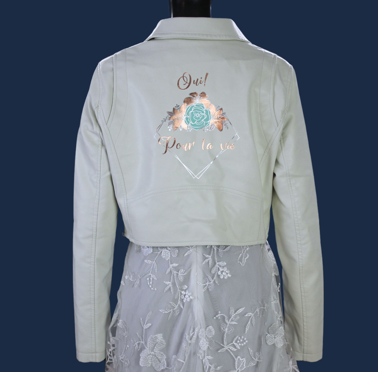Conçu dans une coupe courte et structurée (taille L), ce blouson blanc chaud se distingue par son illustration délicate appliquée au dos : le message iconique « Oui ! Pour la vie » s’entoure de motifs floraux aux reflets cuivrés et argentés avec une finition métallisée, rehaussés d’une touche de vert pastel. Un mélange subtil entre l’esprit rock du cuir et la douceur du mariage, idéal pour sublimer une robe en dentelle tout en restant à l’aise jusqu’au bout de la nuit.