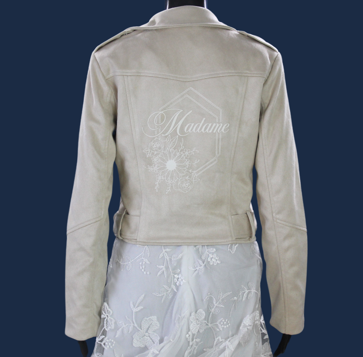 Ajoutez gratuitement vos initiales OU votre date sur le revers de votre veste (côté cœur)